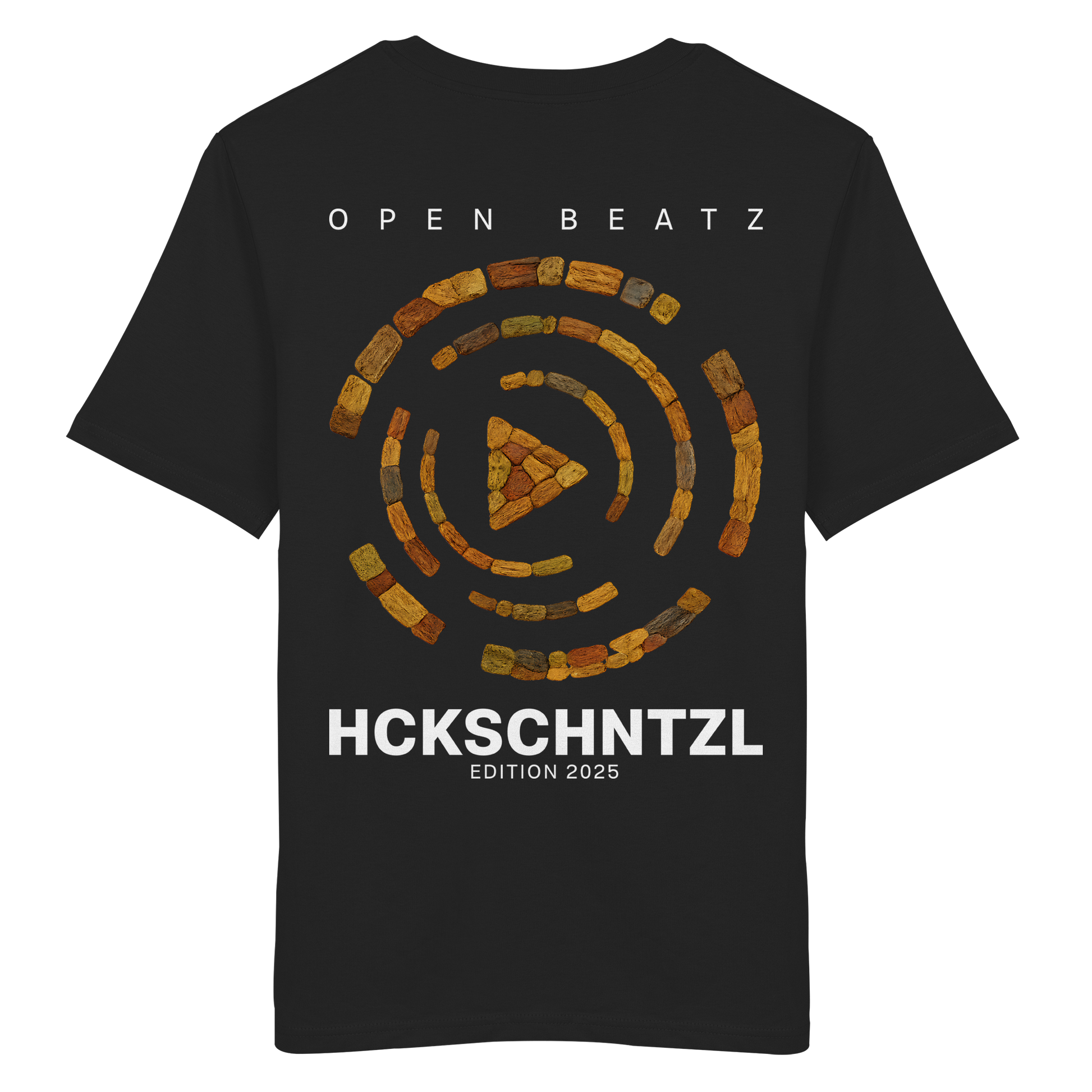 Schlichter „HCKSCHNTZL“-Schriftzug mit Open Beatz Logo und „Edition 2025“ – minimalistisch, klar und zeitlos. Auffälliges, großflächiges Motiv mit Play-Button aus Hackschnitzel-Elementen. Darüber und darunter der Schriftzug „Open Beatz HCKSCHNTZL Edition 2025“ – ein echter Hingucker.